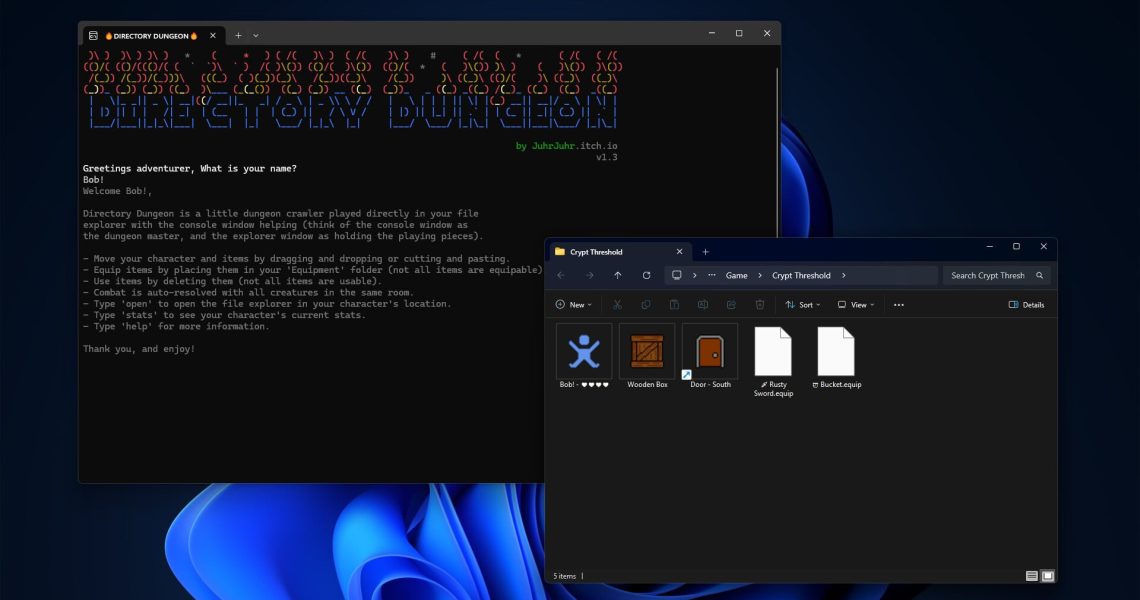 Dans ce jeu, vous ouvrez un dossier C:DirectoryDungeon sur votre PC et dedans y’a des salles de donjon. Ensuite, pour vous déplacer, vous glissez-déposez votre dossier "Player" dans une nouvelle pièce. Oui du vrai drag-and-drop dans explorer.exe.