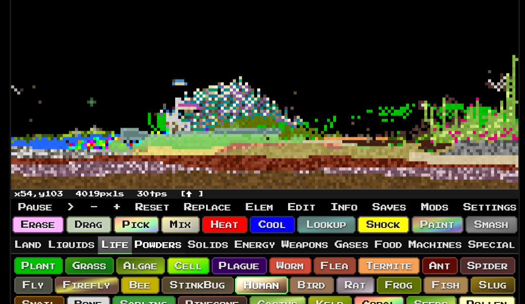 Le concept, c’est que vous choisissez un élément (eau, feu, sable, acide, TNT…), vous le placez sur une grille de pixels, et vous regardez ce qui se passe. Sauf que ça va beaucoup plus loin qu’un bête falling sand game des années 2000 puisqu’il y a de la simulation de chaleur qui se propage, de l’électricité pour créer des circuits fonctionnels, des réactions chimiques entre éléments, et même de la biologie avec des plantes, des insectes et des humains qui se baladent sur votre terrain. Du coup, on peut construire des écosystèmes entiers, des villes miniatures, ou juste tout faire péter au TNT. Chacun son kiff !