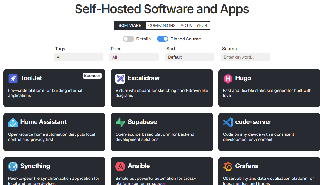 en 2024. En gros, c’est un annuaire d’applications auto-hébergées avec des vrais filtres, du tri, et surtout des indicateurs d’activité. Le mec est aussi derrière la newsletter Self-Host Weekly.